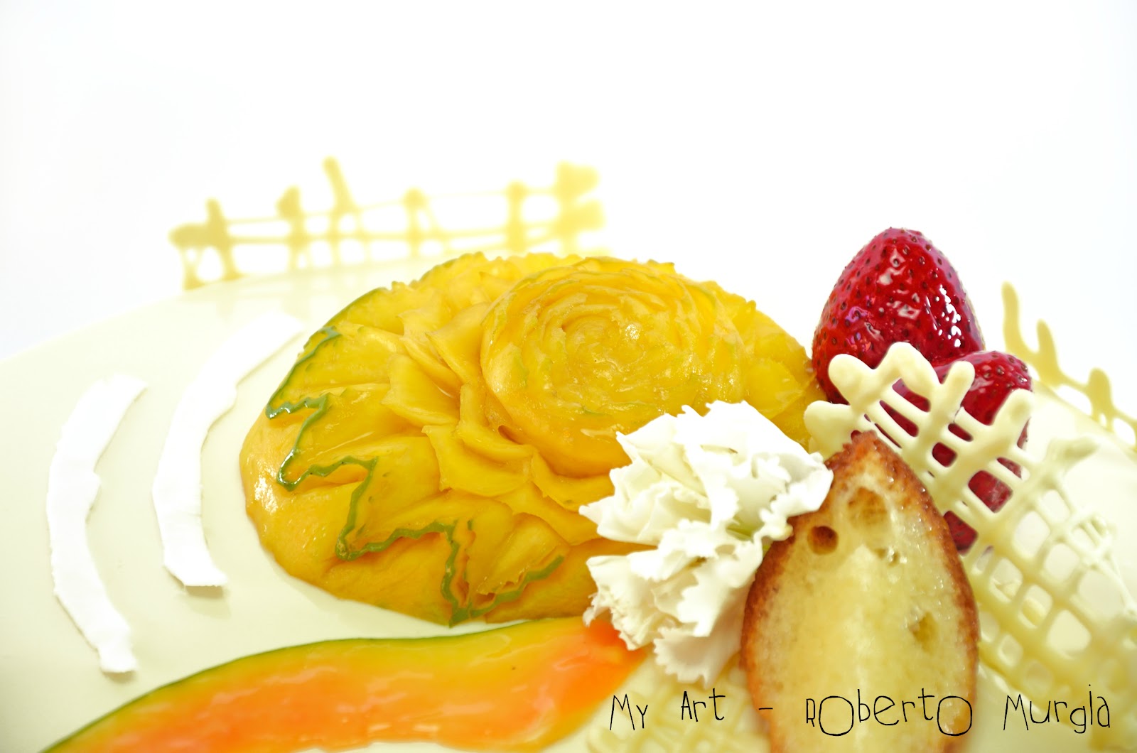 Io l'ho decorata con il cioccolato, la frutta fresca e un mango con tecnica curving e il babà!